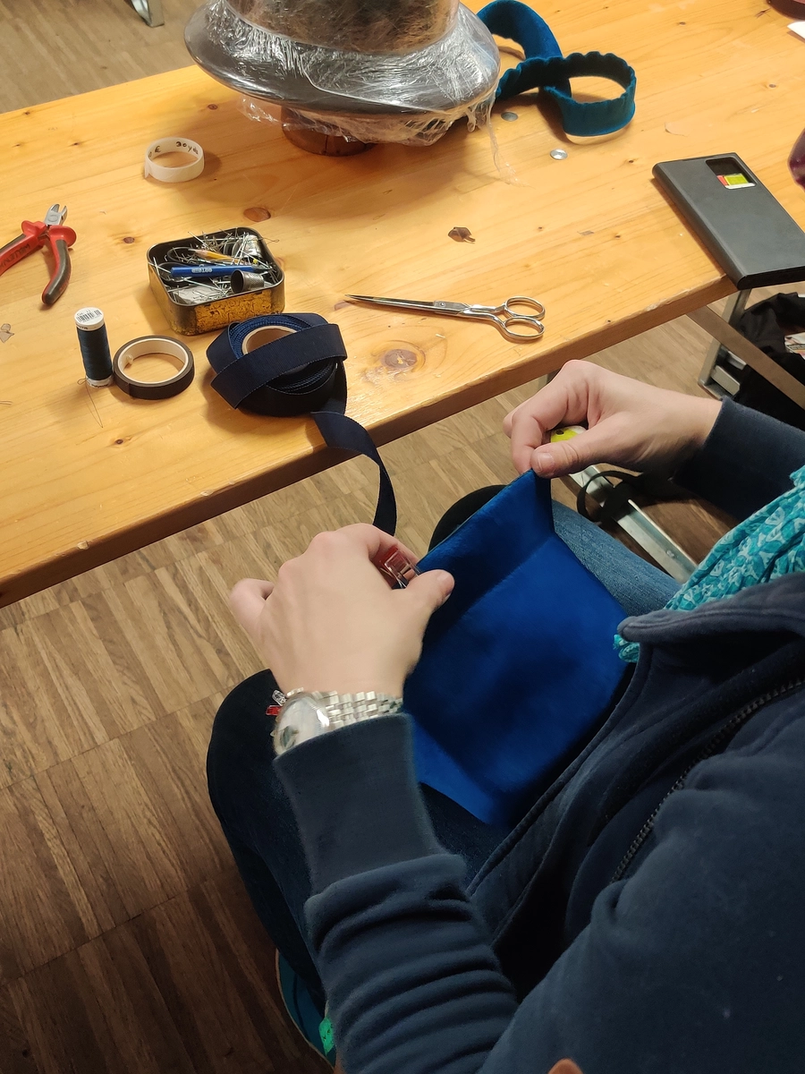 Am 2.Tag geht es zunächst an die „inneren Werte“: der Hut wird von der Holzform abgenommen, Kopf und Krempe zusammengenäht. Er erhält ein Kopfweitenband für den exakten Sitz. Dann geht es an die „äußeren Werte“: die Linien für sein späteres Aussehen werden festgelegt und die sogenannte Garnitur kommt darauf. Sie kann so minimalistisch oder opulent ausfallen, wie du es willst. Wir nähen fast ausschließlich von Hand (es wird schon gar nichts geklebt, auch im Sinne der Nachhaltigkeit!), daher ist Geduld und ein wenig Ausdauer von Vorteil.