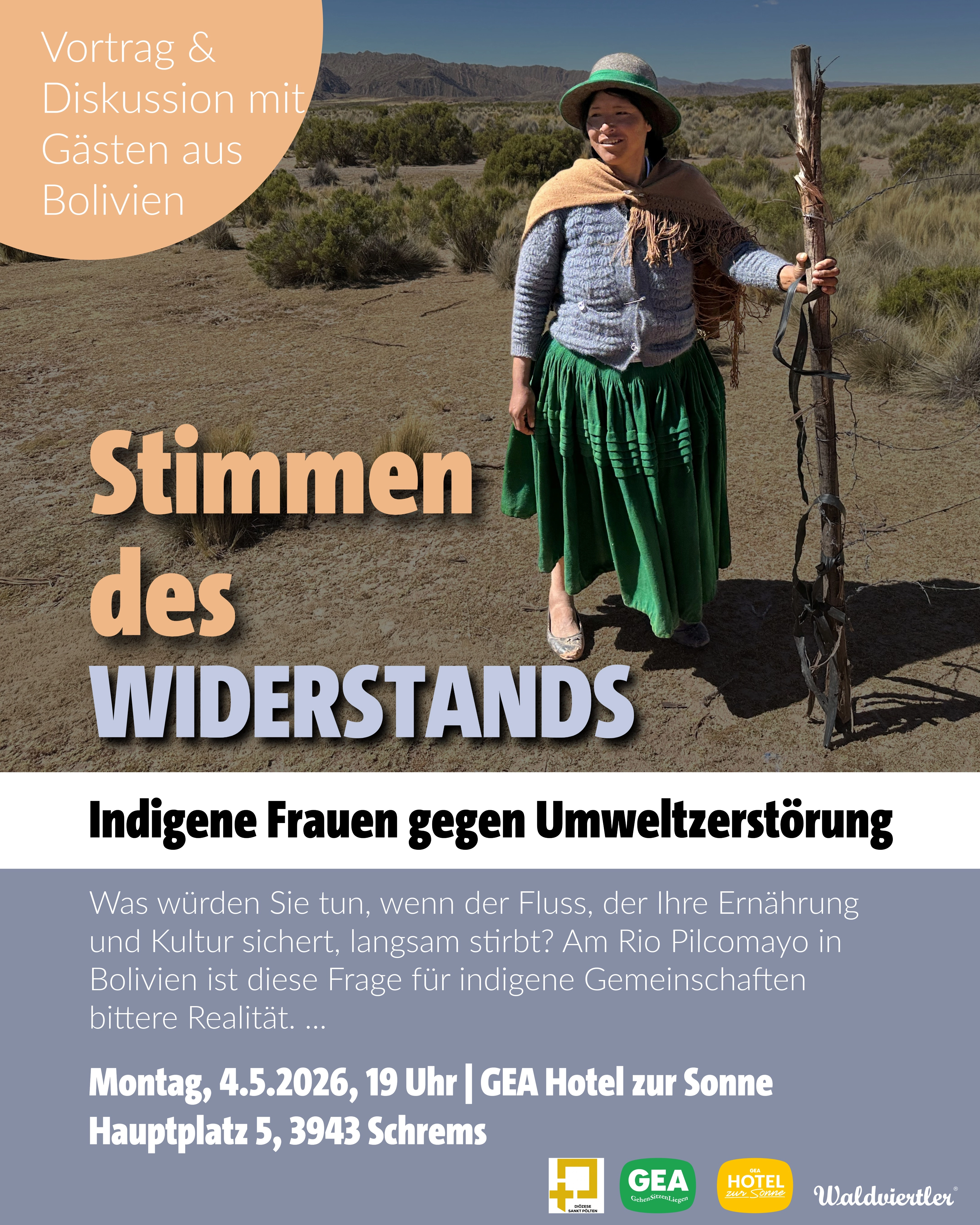 THEMA: Begegnung mit Gästen aus Bolivien am Montag, 4. Mai 2026, 19.00 GEA Hotel zur Sonne: „Stimmen des Widerstands – indigene Frauen gegen Umweltzerstörung“