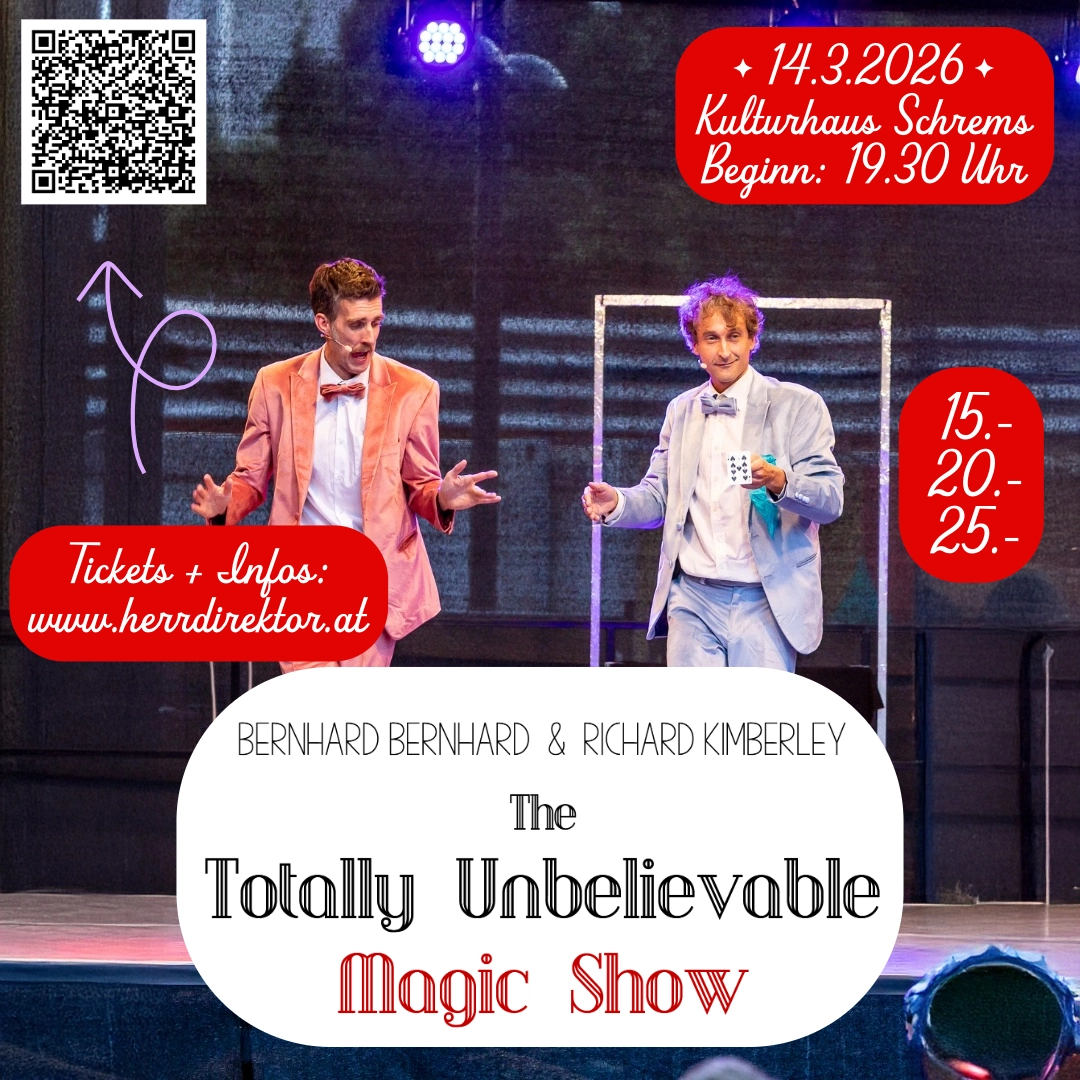 Weitere Infos: www.bernhardbernhard.com/ttums Reservieren: https://www.herrdirektor.at/en/events/the-totally-unbelievable-magic-show-kulturhaus-schrems