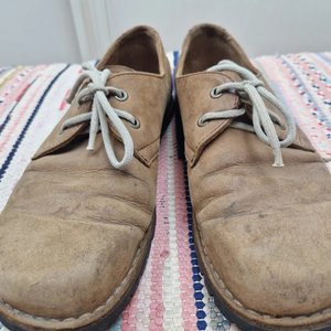 Farbe Ocker, Größe 39, Weite F gern getragen aber keine massive Abnutzung (s. Fotos von Sohle) ein paar Flecken am hellen Leder, möglicherweise entfernbar?