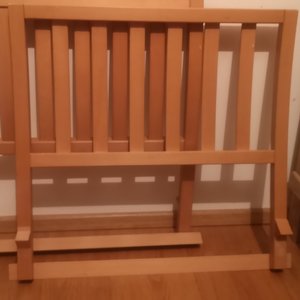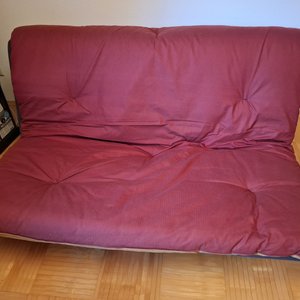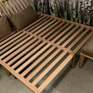 Vollholzsofa (B 160, T 115, H 70) Buche ohne Metallteile mit Bettfunktion (160 x 200), faltbare nachtblaue Matraze (Kokosfaser) und elegante Wendeauflage (Fischgrät rot und gold). 1 Woche als Gä…